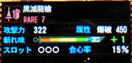 爆属性长枪本作自带的有3把,碎枪,阎王枪和红黑枪。综合比下来红黑枪完胜了,虽然物理最低但是爆破属性最高,优点加匠紫斩,极高爆破属性,自带3洞,自带15%会心。如果有好护士的话配出业务,匠,防2的话就变得非常犀利了,而且它是所有红黑武器当中最好做的。