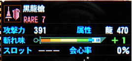 龙属性长枪本作的几把都不错,不过综合比下来还是黑龙枪比较好。优点加匠紫斩,高龙属性。物理比天回枪高,不过天回枪的高白斩和高会心也是优点,但是黑龙枪的紫斩真是强出不少。
