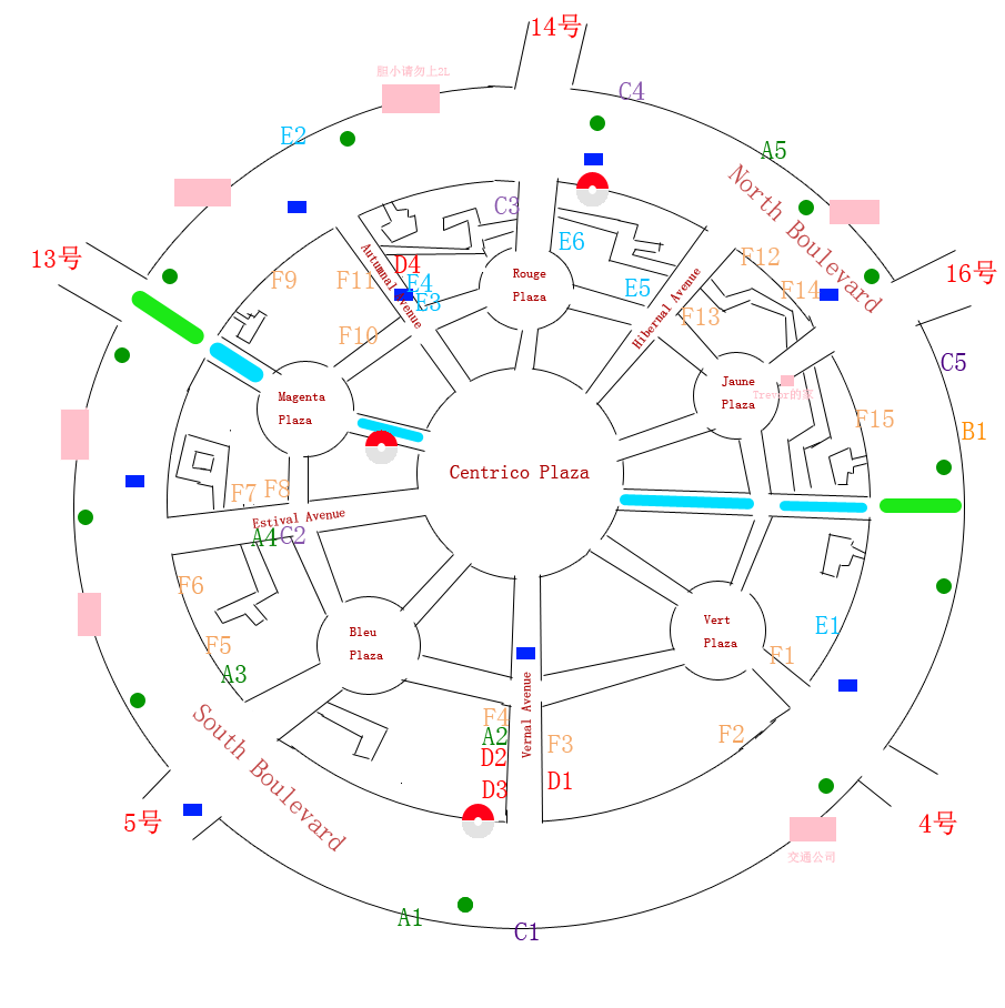 粉色方块为普通办公楼,部分楼内有道具、NPC委托等。