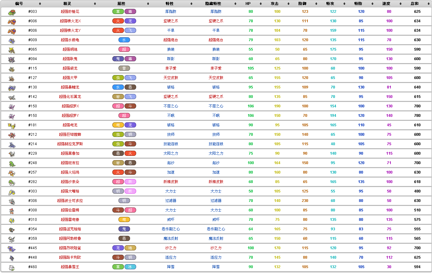 | 编号 | 精灵 | 属性 | 特性 | 隐藏特性 | HP | 攻击 | 防御 | 特攻 | 特防 | 速度 | 总和 |