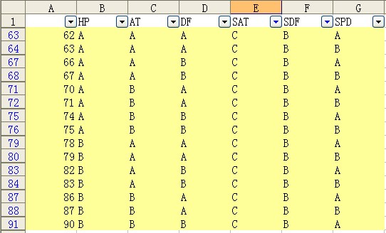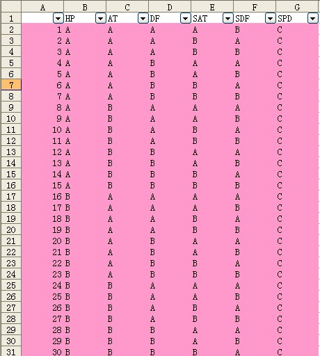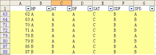 假设♂PM的HP AT DF SPD为31,♀PM的HP AT SDF SPD为31,目标5V,SAT不重要,让它随机。我们利用excel的筛选功能,确定SAT=C,然后DF=A(遗传了父亲的防御),SDF=B(遗传了母亲的特防),剩下来3项遗传谁的都可以,不筛选。符合条件的情况有8种。