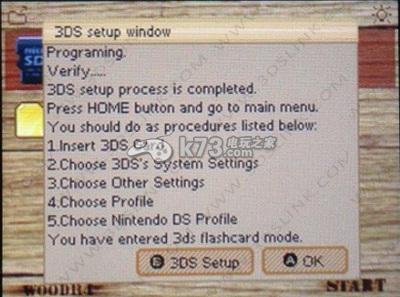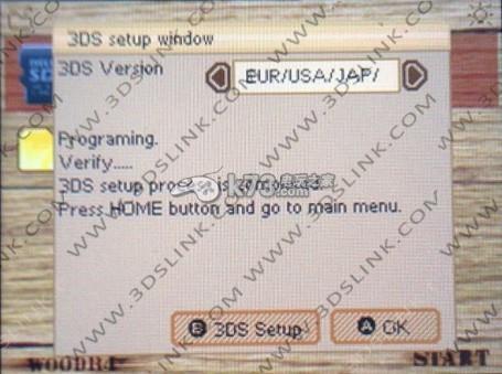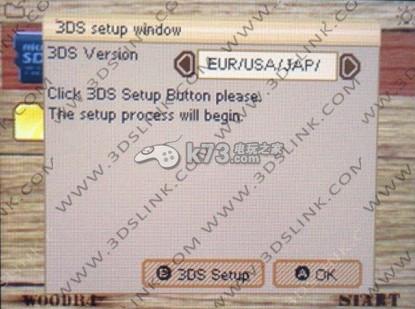 6.点击start键 7.并选择3ds setup进入以下界面。 8.选择你的3ds主机版本,然后点击B键进行安装,等待2秒钟安装完成 9.安装结束后,点击HOME键退出程序返回主菜单 第三步:进入3ds link模式 1.将固件工具文件夹中的Launcher.dat这个文件拷贝到SD卡的根目录当中(SD卡无需格式化) ![]() 2.将SD卡插入3DS游戏机,选择系统设置→其他设定→用户情报→DS软件设定 3.静待5-8秒,切勿操作,机器将自动重启 第四部:游戏卡(红卡)的制作 1.使用读卡器或者其他设备将一张MSD卡连接到电脑 2.将烧录工具解压,运行Win32DiskImager程序 3.点击文件夹图标,选择自己要烧录的游戏ROM,即*.3ds文件。注意进入对应的文件夹后,将文件类型的下拉菜单选择为全部类型才会显示*.3ds文件 4.在右侧Device的下拉菜单中选择正确的盘符烧录(请注意,MicroSD卡的容量大小一定要大于3DS ROM的体积) 5.点击WRITE,再点击弹出菜单的YES开始烧录 6.弹出以下窗口时烧录完成