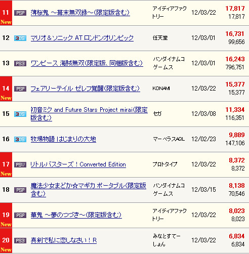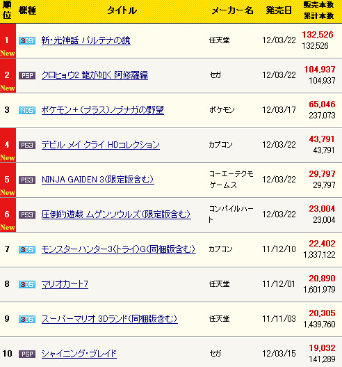 毫无悬念,本周的榜首被上周发售3DS满分作新光之神话夺得,共售出了132526份,表现非常抢眼;第三名被前两周发售的口袋妖怪与信长的野望摘得,本作借助口袋妖怪的名号及本身的优秀素质,得到了众多玩家的喜欢,本周卖出了65046份,累积销量也突破了20万大关。而3DS三基友果然激情依旧,牢牢的占据着前十的三个位置,排在第七,第八和第九名。而初音MIKU和牧场物语仍然在前20之内,分别位居第十五和十六。