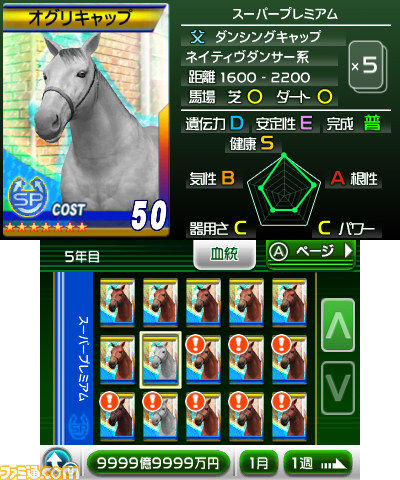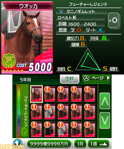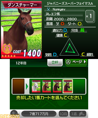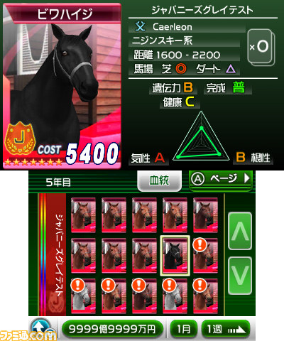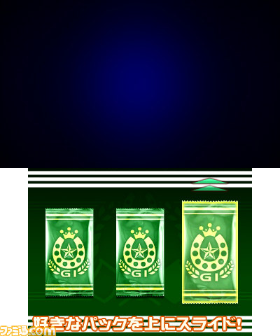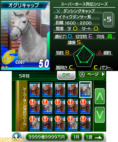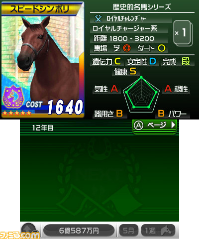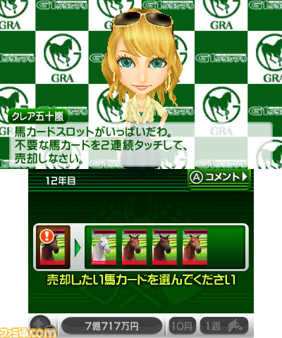 本作是一款正统的赛马培育游戏,模拟马主获得最终赛马比赛的胜利,登录平台为任天堂的3ds掌机,标题为《G1大奖》。本作是一款馬主对各种赛马培养、体重奖获得的胜利目标的赛马培养模拟游戏。本作将任天堂3ds的3D立体机能活用到了比赛中,通信功能活用了擦身通信
