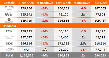 PSvita的销量持续下滑,由于缺乏新的游戏,其销量只有其主要竞争对手3DS的36%。而3DS则是上周的最大赢家,比上一周销量上涨了将近40000台。销售额同比去年看并不是太好,每一个平台都有所下滑。而且一年前这还是3DS在欧洲推出的日子。整体销售方面,与上周相比上涨了1%,而与去年同期相比下滑了40%。