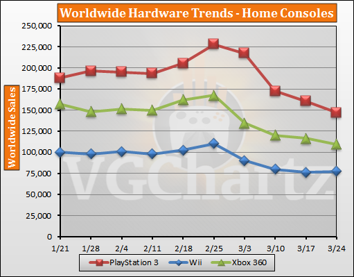 在PlayStation 3和Xbox 360销量连续第四周下降,而Wii的销量已经稳定下来了。PlayStation 3占有44%的市场份额;,Xbox 360占有33%的市场份额,而Wii则占有剩余的23%的市场份额。PlayStation 3已经连续第13周成为家用机销量第一。10周前相比,所有三个家用机的销量均有下滑。