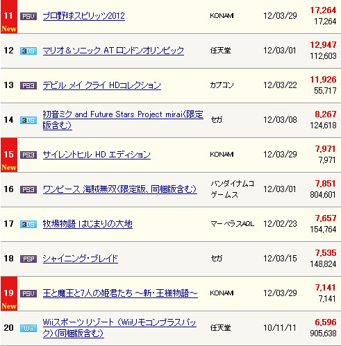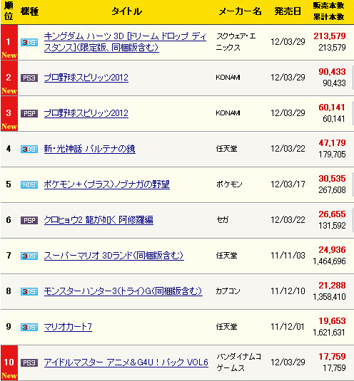 2012年3月26日~4月1日日本销量出炉:王国之心3D大卖