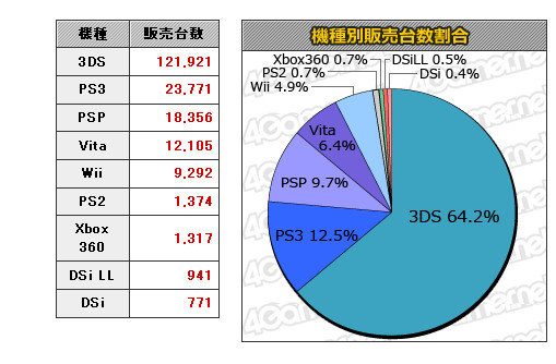 硬件销量方面,借助王国之心3D的大卖,本周3DS销量终于破了10W大关,以121921的销量继续占据着榜首,是第二名PS3销量的将近6倍!!!在本周硬件销量中达到了64.2%比重!由于PS3没有什么新游戏大作,销量在本周得到了回落,以23771的销量位居第二。PSV本周仍然没有干过其师兄,相比PSP的18356台少了6251台,但是相比上周有有些许的增长。其它硬件销量方面基本上都比较稳定,DS系列主机本周都没有破千,可以说完成了其新旧掌机任务的交接,看来DS离停产估计不远了,不禁有些感怀。