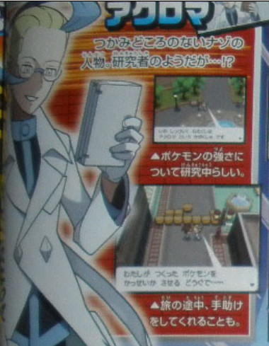 在主角旅行途中帮助主角的研究者——阿库罗马。作为一个研究员他正在研究口袋妖怪的力量,从截图上来看他似乎是想要激发口袋妖怪的潜在力量,这个难以捉摸的研究院的真实身份是……?