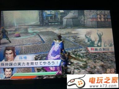 对于战场中的场景,暗荣是没有下足功夫的,一些贴图有着不小的违和感,某些木板和箱子会让人觉得是很突兀的贴在那里的,不能很好融入战场,不过开启3D后情况会好些。战场环境方面也有些“半成品”的感觉,过于简单,重复场景不少,对于远景也只是简单的群山并且没有立体感。虽然这样让画面很干净,但还是少了些代入感。在同屏人数方面,游戏的表现着实不错,目测最多可以达到20人左右,要想找到“无双”的爽快感是没有问题的了。对于一些动作的画面特效,本作做得比较简单,没有添加过于炫目的效果,使用的配色也少有变数,但难得的是它可以将这些效果一个不漏的表现出来,在激烈的战斗中让整体的画面显得比较华丽,这也大大增加了游戏的爽快度。