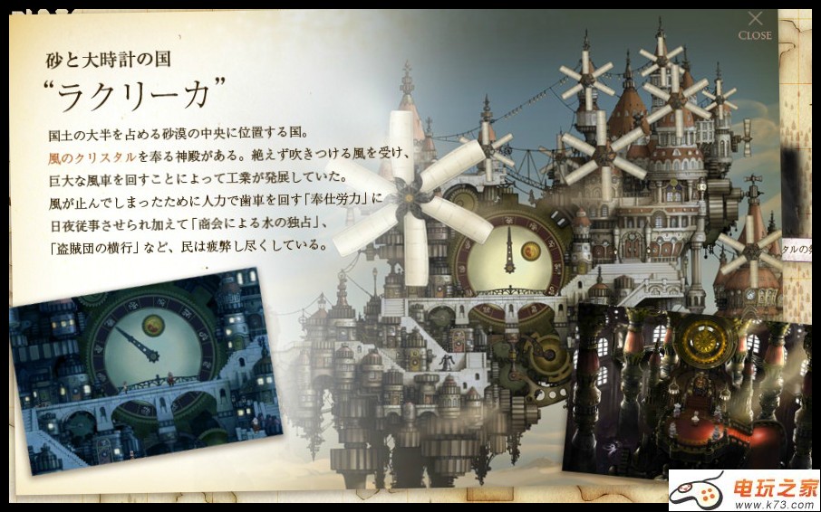 国土的大部分都被沙漠包围的国家,在国家的神殿中供奉着风之水晶,可以使国家免受风沙的侵袭。依靠风车获得了巨大的工业发展,如果风停止的话,整个国家都会陷入混乱。