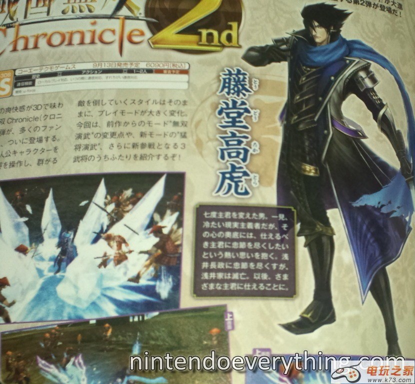 日前,KOEI公布了一条惊爆的消息,其将会在3DS平台发售名为《战国无双编年史 2nd》的新游戏,本作为3DS初期受到玩家一致好评的《战国无双编年史》的续作,本周的fami通将会公布更多后续消息,届时请留意本站的报道。