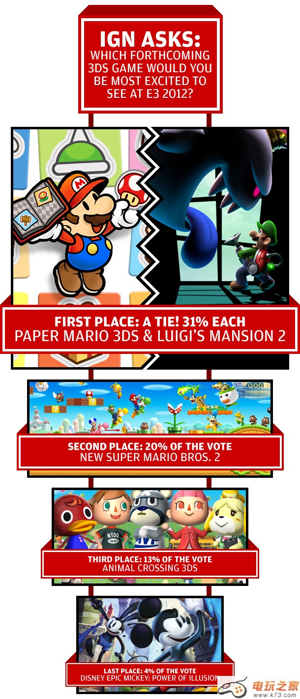 日前,IGN网站公布了其新一轮的游戏期待投票,本次的投票主要针对的是E3 2012上玩家最想看到的3DS游戏,让我们来看看有哪些游戏入围吧!