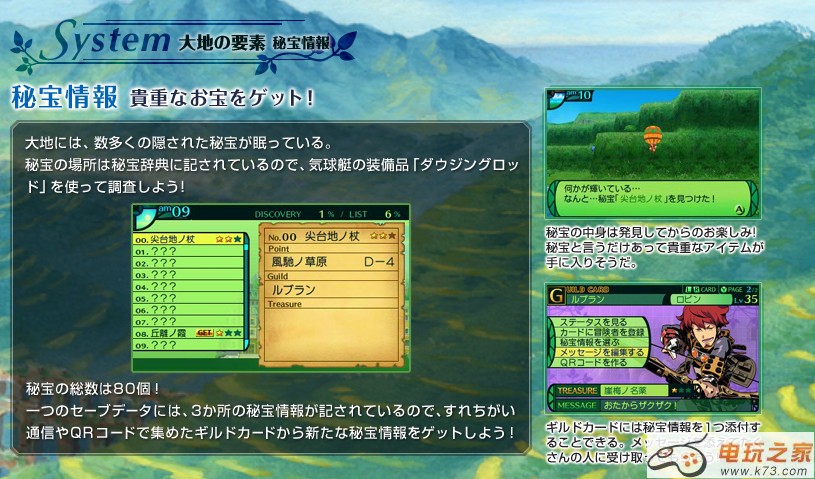 游戏中秘宝的总数一共多达80个。玩家可以通过擦身通信和读取QR码的方式来获得更多的秘宝。