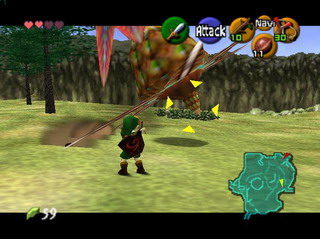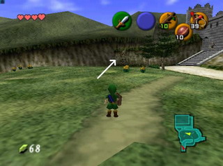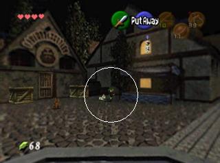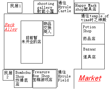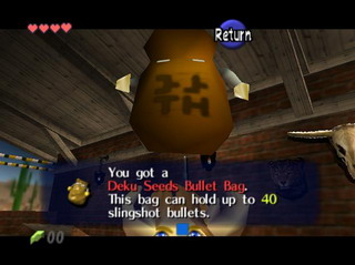 2.在Shooting Gallery(射箭小屋,仅在白天开放) 中可以花20Rupees玩射弹弓游戏,一共10个Rupees,如果都射击成功的话得到Deku Seed Bullet Bag(德库种子的升级包), 能装40个弹弓的弹药了。如果再玩一次又全打中的话,能得到50Rupees。