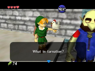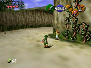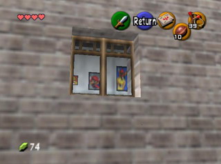 先不忙出去,在这个院子里你通过其中的一个窗子,可以看到一些异次元空间的东西(如图)……现在往回走吧,能遇见塞尔达公主的守卫Impa,她会教你游戏中第一首乐曲Zelda’s Lullaby(塞尔达摇篮曲),用C键的方向键就可以演奏了。今后在菜单中的任务状态栏会记录下你所学的每个乐曲,忘记的话就去翻翻吧。