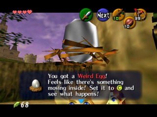 历经千辛万苦,LINK终于来到王宫的脚下了!和烦人的猫头鹰大叔对完话后,回到Market,然后再回来就发现有一个小LOLI站在树藤下,她自称是Malon,是Lon lon Ranch(隆隆牧场)场主的女儿,原来她父亲到城堡里送牛奶,一直没回来,估计是在里面睡着了(= =),想请LINK帮助找一下,LINK当然是义不容辞的答应拉。然后Malon送给你一个快要孵化的Weird Egg(神秘的蛋),它的用处过一会就知道了(在Martket如果没与她搭过话,这里要对话两次)。