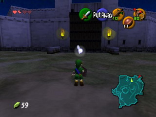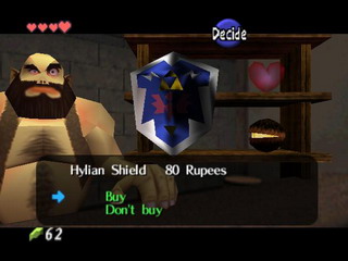 1.在Bazaar(道具店,仅在白天开放)可以花80Rupees买到升级后的盾:Hylian Shield(海拉鲁盾),嫌贵的话在刚进城门时经过的门卫的房间里就有大把的钱拿。当然以后还能免费拿到,买不买就看你的意思了。不过少年时期用这个盾的话可能不太合适,因为太大了,只能背在身上防御,而且锁定时防御也无法移动。唯一的优点就是不怕火烧。