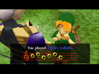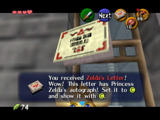 通过五部分的守卫后,终于来到了王宫的最深处。梦中的塞尔达公主就活生生地站在对面,当然首先和她对话了,然后又是一大段剧情……大意就是塞尔达公主已经察觉到了Canondorf(盖侬道夫)想要通过获得(Triforce)三角之力来统治世界的阴谋,所以必须去找到另外两块精灵石,然后和已经得到的森林精灵石一起,通过Ocarina of time(时之笛)打开时之神殿的时之门,进入圣地抢先拿到三角之力,从而阻止Canondorf来毁灭Hyrule。接着ZELDA公主为了能让LINK自由活动,给了他有自己亲笔签名的ZELDA’S LETTER(塞尔达的信)。