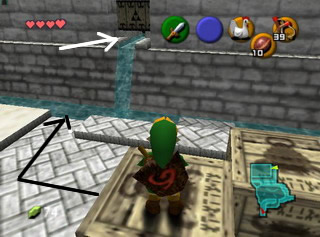 别人的事解决了,那么自己的事呢?看到对面墙上下水道的洞了没有(白箭头方向),那里应该能爬进去,把下图中LINK脚下的箱子先沿黑箭头的路径推到水里,在把另一个箱子也按照同样的方法推到前一个箱子的上面,然后跳到对面的洞前,爬进去。