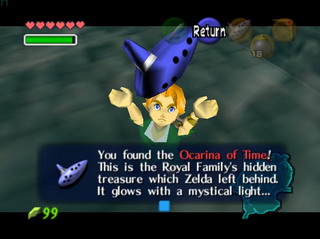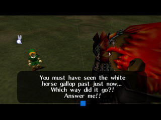 现在能直接回到Hyrule Field了,经过ZORA’S RIVER的时候,试试漂流吧,也是满好玩的,还能拿到不少钱。当靠近Hyrule Castle的大门时,发现了有些不对劲的地方,城门紧闭,而且天空也阴暗了起来,难道是……?这时出现了和LINK的恶梦中一模一样的场面:IMPA带着ZELDA公主在马上狂奔,然后惊恐的公主看到了LINK,把不知什么东西用力地扔向了他(好大的臂力啊……),接着,就是LINK永远的敌人:Ganondorf登场了。他这时根本不把小LINK放在眼里,轻轻一招就把他击倒了,但放了LINK一条生路(你以后会后悔一辈子的……),然后就继续去追公主了。