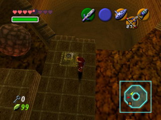 区域22也比较简单,先用锤子砸那个有脸形图案的柱子,使台阶显现出来,然后搬一个小木箱到门前的开关上压住,开门后来到区域23,照旧砸突出的石块到达下一层,落入3F的区域15内,向前爬上平台,砸那个看起来生锈的开关,通往区域17上层的门开了,进入后对着蓝色石块吹奏SONG OF TIME,使石块移动,露出后面的生锈开关,砸下去后又救出一个Goron,拿到小钥匙。