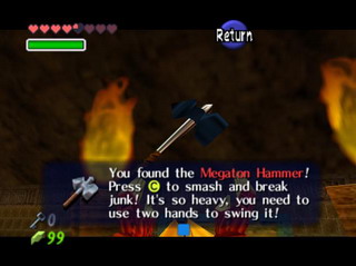 打完BOSS后,通过房间中间的石台来到4F的区域19内,又是一个需要通过站在上层来射击下层水晶的一个小迷题。成功后火焰消失,来到5F的区域20内,这里类似于一个旋转楼梯的房间,先踩下不远处的小开关使顶层宝箱的火暂时熄灭,然后顺着靠内径的小路来到宝箱的所在,里面是本迷宫的关键道具:Megaton Hammer(万吨巨锤?)