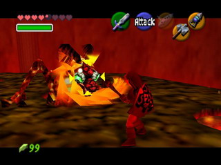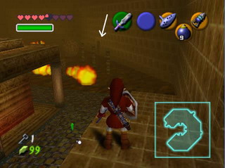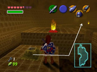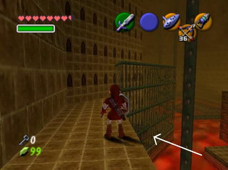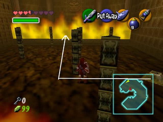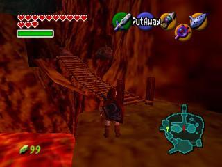 回到区域1,用小钥匙开启区域3的门,这是一片相当大的区域,不过目前要去的地方也不多。先去桥的左边,通过几个浮在岩浆上的石块一直来到最左边的门前,来到地图上很小的区域4内,同样能救出一个Goron和有一个装有小钥匙的宝箱。刚出区域4后,注意到门的上方有一块蓝色的石块了么?吹奏Song of time,使石块转移下来,利用它爬到平台上层来到区域5,其实这里就有一个黄金蜘蛛,有个怪会把你吸进去,抢走你的盾牌和红色的衣服,只要把它干掉就能夺回来了。接着去桥的另一侧。走到最右边的平台上能看见一块和地板一样颜色的墙壁,用炸弹炸开,来到区域6,又能救出一个Goron和拿到一把小钥匙。回到区域3的桥面上,这样就可以打开区域7的门。