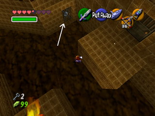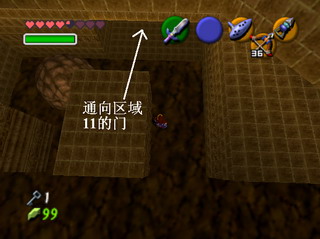 进入区域10,跳到有怪物的对面平台上,很容易能看到地板上有个裂缝(走进后NAVI会提示你),用炸弹炸开后跳下去来到区域9,这里就是刚才能看到但没法救的Goron处了,照例对完话后拿箱子中的小钥匙,然后返回到刚才跳下来的地方。