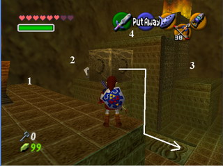 先不管关在笼子里的Goron,首先向左爬上有怪物的平台,消灭之,然后从下图的1处跳到2处,把石块按箭头方向推到底,到雕刻有图像的地板上,然后跳到3处,爬上4处的平台,在4处的边缘找好角度,用弓箭射击2处的水晶,4处上层铁丝网处的火会暂时熄灭,迅速爬上即可,开门来到3F的区域10。