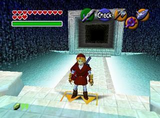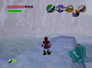 这回该去Zora一族看看了,通过Zora’s River(佐拉之河)来到zora’s domain(佐拉的领地)。这里怎么变成冰雪大世界了?连ZORA族首领都被冻起来了,不知道都多长时间了。通过王座后面的通道来到ZORA’S FOUNTAIN(佐拉之泉),那条外星鱼怎么也没了?在原来那条鱼的地方有几块浮冰。现在要去的地方在右下角地图的正上方的洞口,那个象半个椭圆形的洞。跳过几个浮冰来到这里,进洞就是一个微型的迷宫:ICE Cavern(冰之迷宫)