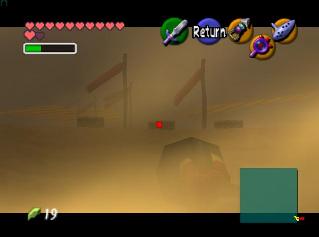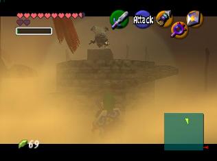 这个地方没有真理镜子的话是很不容易通过的,风沙极大,动不动就会迷路了。首先站在木箱子上面,用绳勾射对面的木箱子才能过去,然后顺着最近的绑着红带子的木柱子走,直到来到一个很低矮的小房子面前(小房子里有个黄金蜘蛛,用din’s fire同时点燃两个火台可以得到50块钱),用真实之镜可以看到房顶有个小幽灵,走进它后对话,然后就开着真实之镜跟着它走就能出沙漠了。