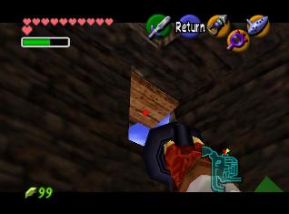 这里其实就是一个盗贼的根据地,而且还都是女盗贼的说。要想混进去也很容易,走到台阶上,自动就会有人把你扔到牢里~囧……其实对LINK来说,关了和没关一样。注意到那个墙上的天窗了吗?用绳勾勾住木板很容易地就能上去。然后跳往左边的房顶上。进入Thieve’s Hideout.