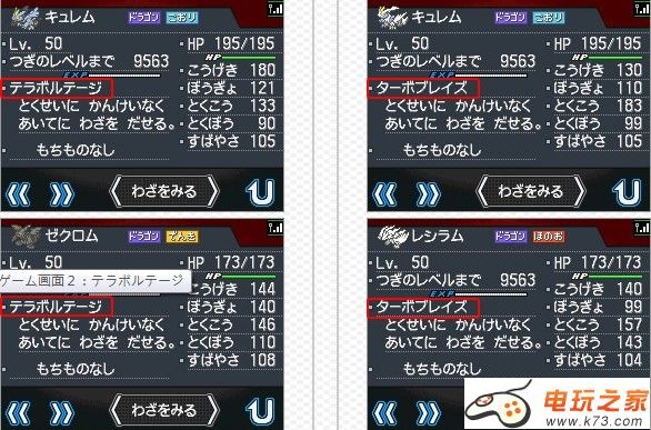 黑酋雷姆的特性,与ゼクロム一样,属于“テラボルテージ”;而白酋雷姆的特性,与レシラム一样,属于“ターボブレイズ”。