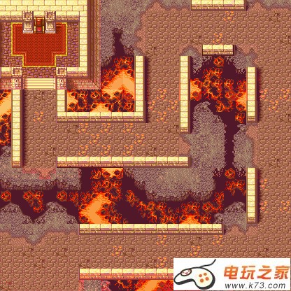 料理了后面敌人后,就该最大限度调整战斗力,一举将前面的敌人消灭掉,这里要注意的关键并不是敌人的实力,而是那些暗红格子的地板,这些地形是会喷出火焰的,一不小心站在上面,很容易被火舌击中,很可怕哦,一次可要耗损HP10点呢,要是重伤虚弱时再被敌人补上一击,那就挂定了。这样的结局相信谁也不会接受的。