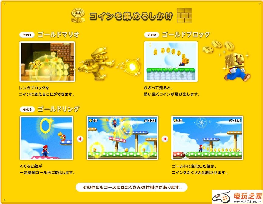 关卡中有很多可以用来收集金币的机关,游戏中收集到的金币全部都会累计。收集总数100万枚之后可以得到“金色马里奥像”,使得游戏本身也可以反复地玩。