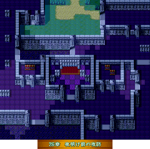 攻略:本章的地形相当特殊,每一个回合结束后,地形方块会消失与增加。一点角色跌入水中就无法移动,海贼与飞行系除外。要注意本章的几名魔导系角色,身上带有混乱杖与(サンダーストーム)魔法,尤其是BOSS的远程攻击相当的强劲,移动中多加注意敌人的飞行系角色。BOSS身上的(闇の誓约书)是不错的东西,盗贼的专职就靠这本书了。但要记住盗贼专职后无法再盗取道具。20回合后所以石块都会开启,这就大大提高移动速度。出击前最好带上一把(レスト)开治愈混乱的角色。