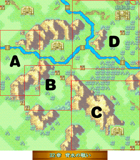 一开始必定出击的尼尔斯会送上一件地之刻印,还不错。本章的敌人增援多得离谱,因此系统所定的经验评价要求非常高,派几名用来混经验的低等级同伴出击是很有必要的。如地图所示,ABCD四个区域都有敌人的埋伏,只要进入那些区域对应的埋伏就会出现。但是,由於敌人的出击上限是只有50的,也就是说,只要敌人数目到了50,满足出现条件的埋伏和增援就会判定已经出现,但实际上不会有新敌人出来^^。所以利用一下这个系统,初期ABC三个区域中的埋伏可以抹杀其中一个,偶抹杀的是A区的5个弓骑。出击之后把同伴分为两队,主力作主队往右下走,一些需要升级的同伴往左上前进,分队最好有狙击手,飞兵和尼尔斯,原因后面解说。主队全速向右边前进,不必多说;分队的飞兵带上防特效和防必杀的道具与其他同伴站在AB两区的边上不要进去。第二回合,主队一个同伴进入C区,先不杀路上那个山贼,右下贤者和魔法师埋伏出现;分队那个飞兵进入B区攻击剑圣或勇者,中间司祭和修道士埋伏出现;此时敌人已满50人,分队其他同伴进入A区,抹杀弓骑。之后飞兵干掉拿混乱杖的司祭和访问中间民家之后和分队汇合。访问遗迹令莱那特成为同伴之后,上面的飞鹰骑士和女武神增援也该出来了,尽量跑到桥旁边保护低等级同伴,同时把敌人那个狙击手打倒,把金色弓箭车抢过来。只要弓箭车到手,就可以慢慢跟敌人耗着练练等级,因为可以随时让敌人增援停下来——满24攻击力的狙击手2次必杀刚好可以把BOSS做掉,就算不满还可以用尼尔斯加必杀率或者再动什么的,基本上之前专门培养过这个狙击手的都应该能做到,这也可以当成停止增援的手段——BOSS一死就不会有增援出现。主队方面,注意一开始遇到的那队龙骑兵,他们带有必杀枪,对斧枪和骑士杀手,小心不要被突击弱小同伴或者骑兵同伴成功。最右下的敌人并不强,但之后增援出现的女武神很令人讨厌,留意一下。再向上就会遇到敌人的远程魔法和弓箭车的袭击,尤其本作弓箭车威力巨大,低等级的同伴甚至有被一击歼灭的可能,再加上右边出现的龙骑,在这里务必要用强力同伴在前面支撑再强行冲击进森林里利用地形提高回避率来应付。这里是整章的最大难点所在,因为BOSS旁边的增援能力不值一提,用远程魔法把敌人的狙击手轰杀是值得考虑的好办法。BOSS的能力很强,所以就算是远程魔法都很可怕,不用弓箭车靠必杀打倒她的话会是个头痛的对象,近身之后的A级风魔法威力也不是开玩笑的,因而尽可能利用宝贵的弓箭车吧。