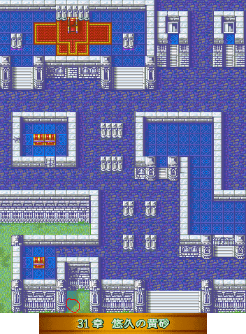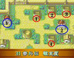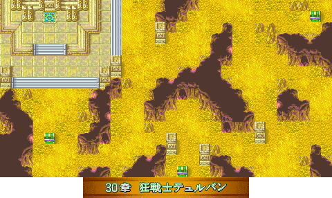 本章由於剧情原因,尼尔斯是不能出击的。总的来说,敌人虽然多,但大多不算很厉害,只要把开始那三个带有异常状态杖的德鲁伊干掉就舒服多了,同时本章也是不错的练低级魔法系同伴的好地方,如果经验评价不行,本章就可以多派点出来騗经验。战斗准备时做好同伴的位置分配,右下方分队的那四个位置必须要有一名带有长弓的弓兵和至少一名带有并能使用レスト杖的魔法系同伴,而且这四个同伴最好都有独当一面的能力。战斗一开始,分队的弓兵马上用长弓把上方带有サイレス的德鲁伊消灭,另一名同伴去堵下方的出入口,其余两个可以攻击上面的暗魔法师,等待下一回合带バサーク的德鲁伊上来就灭掉,再等最后一位用睡眠杖的德鲁伊把杖用光,分队就基本安全了。主队一开始由一两名骑兵或者带デルフィの守り的飞兵向右边前进以便快速清除那里的魔法师和弓兵。另一边可以由一个防御高的同伴带一个低级魔法系走到左边的小通道,先一个一个引那些剑士上来,然后由魔法师解决拿经验。主队剩下的同伴全部来中间,强人当肉盾,低级的捞经验就好。房间内的寳箱可以等左边的剑士们都被消灭之后盗贼再“破墙而入”来拿,下面那个可以等敌人的盗贼开,然后打倒他抢回来即可。反正正常的做法都是留两个同伴对付右上阶梯出来的增援,大部队向下清场滴,如果实在不行就用远程魔法干掉那个盗贼好了。