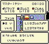 [はいごうする] つよさ:怪物状态查看 けってい:确定 从目前没有冬眠的怪物中选两个异性怪物,分别选けってい进行交配 |