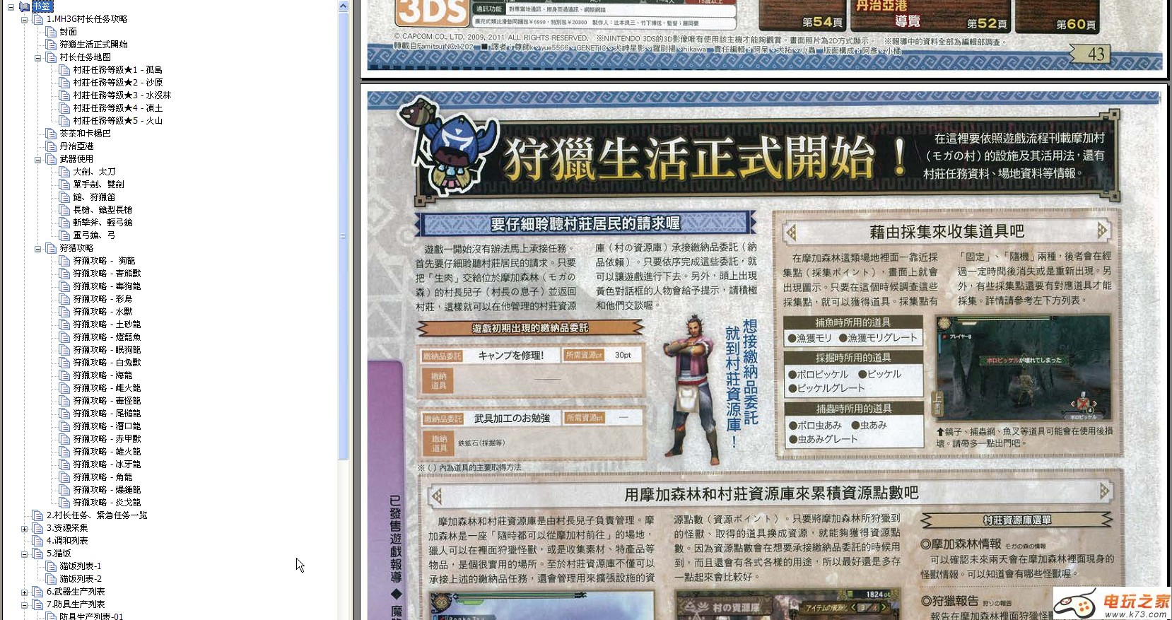 作为一款发售已经有近一年时间的3ds超级大作,《怪物猎人3G》无疑是3DS平台上第三方游戏中数一数二的游戏,游戏诚意十足,不仅加入了G级任务,各种新boss新要素也加入其中。下面给大家带来的是本作的迄今为止最详细的攻略资料下载,包含食材料理、职业技能、狩猎船强化条件、分支任务、奇面族面具等相关资料、杂货店、系统详解、全道具列表、村长任务、紧急任务、调和、猫饭、村长任务攻略、武器生产及强化、防具资料、武器资料以及肉类的分布和资源的采集,希望大家喜欢。