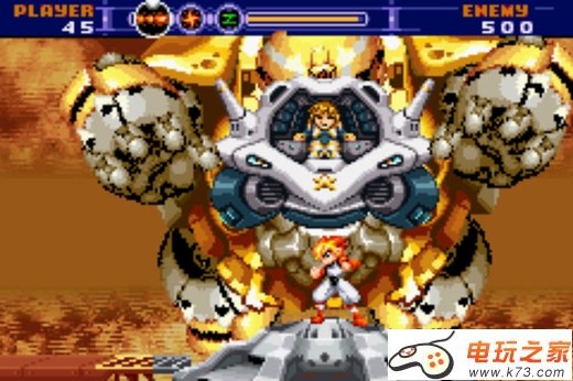 5.掉到崖下,开始第一大关总BOSS战,简单的不得了.等它脚抬起的瞬间滑铲出去,跳到它头上按住方向键猛K它,谅它怎么动也甩不掉你了 K.O~