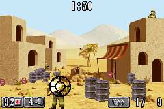 刚登陆的时候会被两架飞机轰炸,向前进入雷区的时候会有敌人阻拦,消灭敌人后向上移动,进入下一区域后左边有个急救箱右边是子弹夹,接下来你要完成你的第1个任务,你需要消灭4个枪兵和2个手榴弹兵,每完成一个任务都会有提示,向上走有一个记录点,左边一个机枪兵守着弹药库,炸掉弹药库后会有几个小兵从下面上来,你可以练习一下机枪的使用,之后从右边走炸开门后进入要塞,在里面有不少房间是打开的,内部有补给物品,进门向右走有条小道里面是个医疗帐篷,一路消灭敌人并前进,在左上角的有个机枪守着的房间里有你要找的DESERT MAP DOCUMENT,由于这里敌人比较多所以在手榴弹兵的右边放了个急救箱方便玩家,拿到任务物品后炸开大门向上,做到机枪上消灭掉蜂拥而至的敌人后任务2完成,先上看到最后的任务灯塔,冲啊……打最后的两个机枪兵的时候不要冲得太靠上,否则敌人的援军会提前到来,利用机枪击退最后一批敌人,进入灯塔任务完成