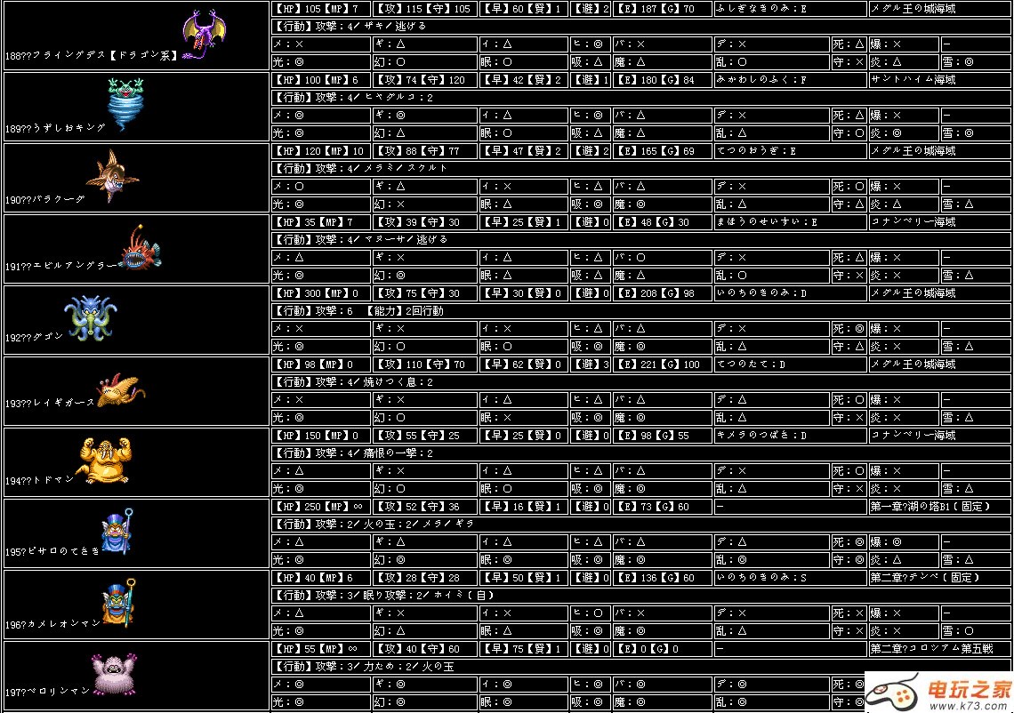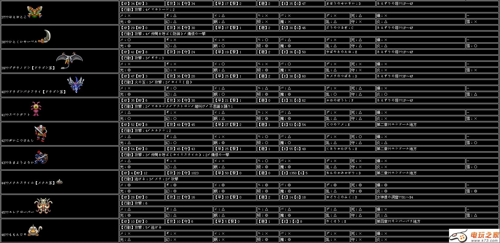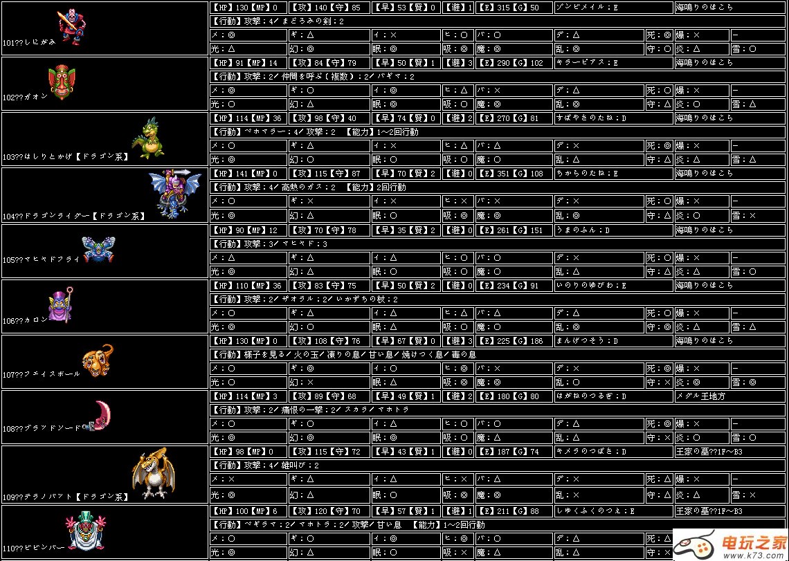 发售于nds平台的《勇者斗恶龙4》继承了PS版本的怪物图鉴功能,并且加入了一些新的怪物,下面就让我们来看看本作中登场的全部怪物的资料吧!让你知已知彼百战不殆,同时还能集齐所有怪物图鉴。