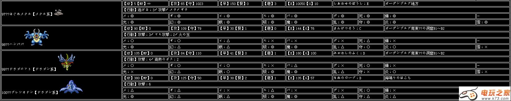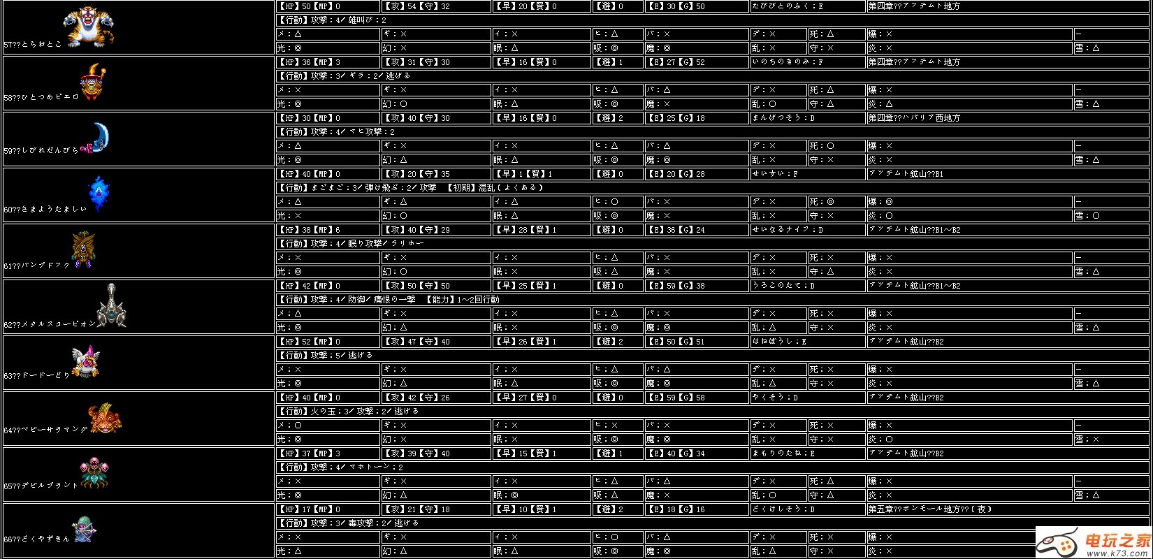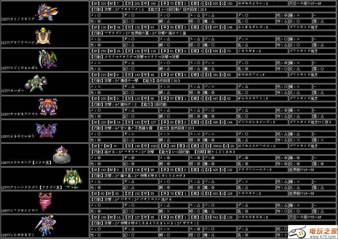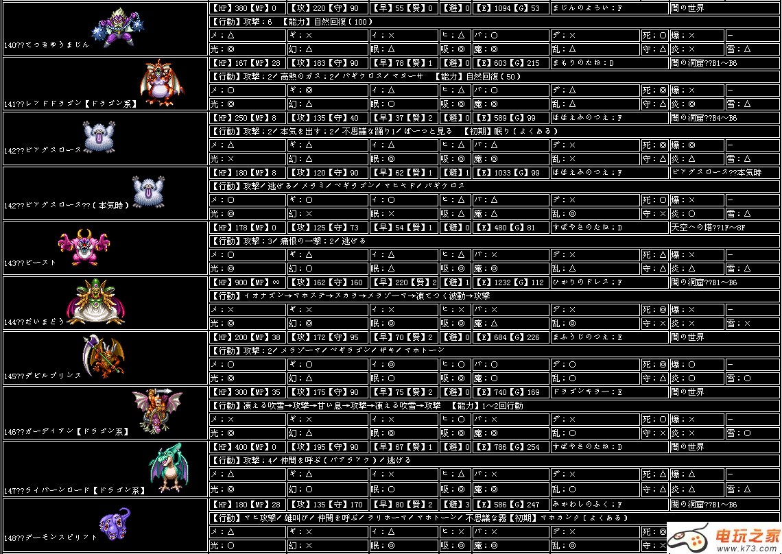 发售于nds平台的《勇者斗恶龙4》继承了PS版本的怪物图鉴功能,并且加入了一些新的怪物,下面就让我们来看看本作中登场的全部怪物的资料吧!让你知已知彼百战不殆,同时还能集齐所有怪物图鉴。