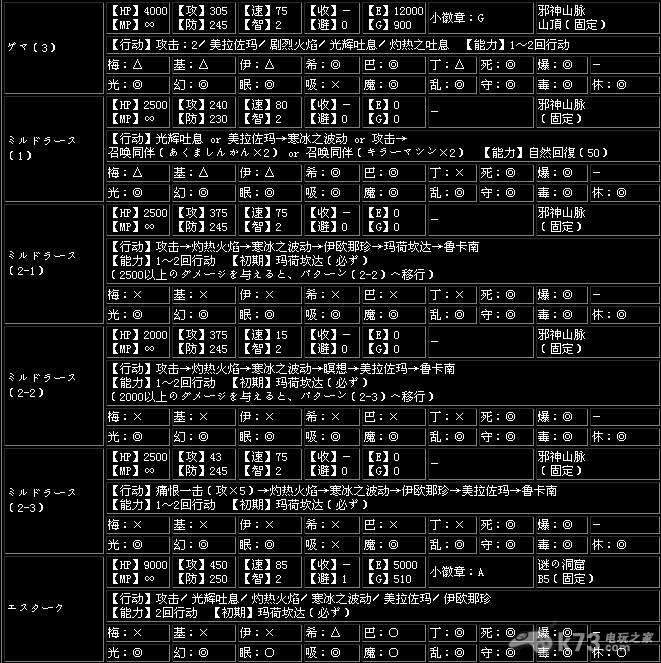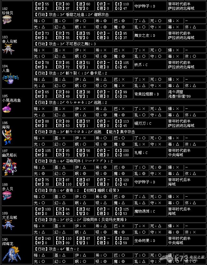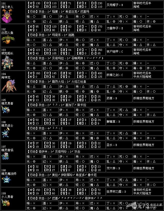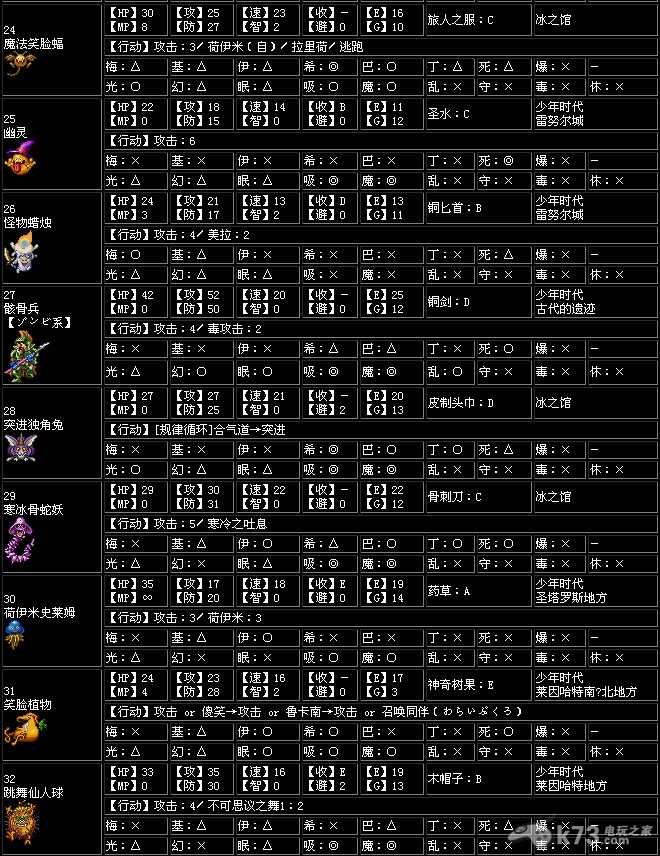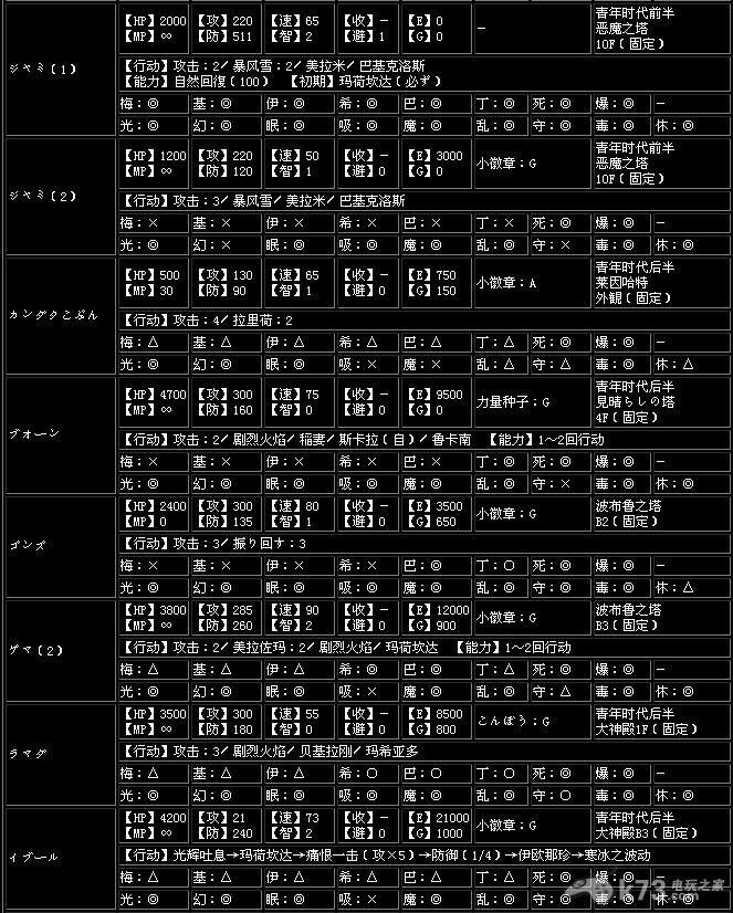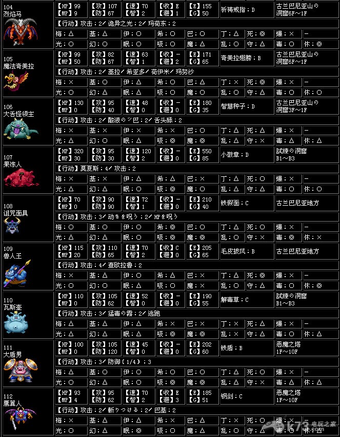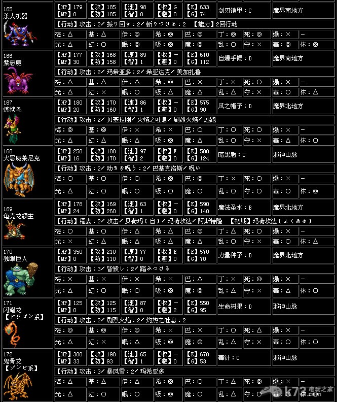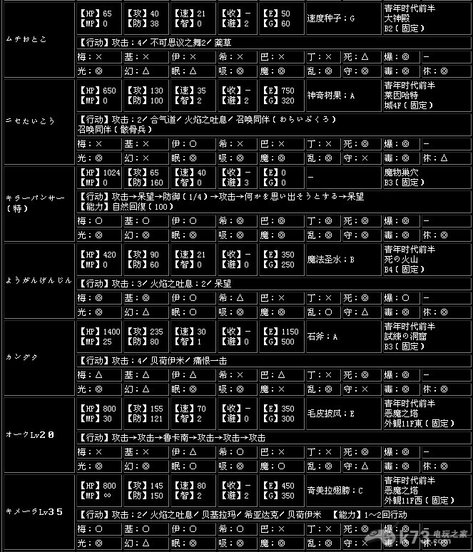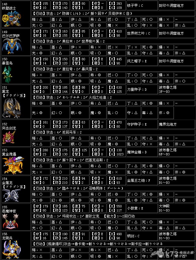 收服【收】…打倒怪物后加入同伴的概率,一共有A~G7个种类,A为最高,G为最低,-为无法加入