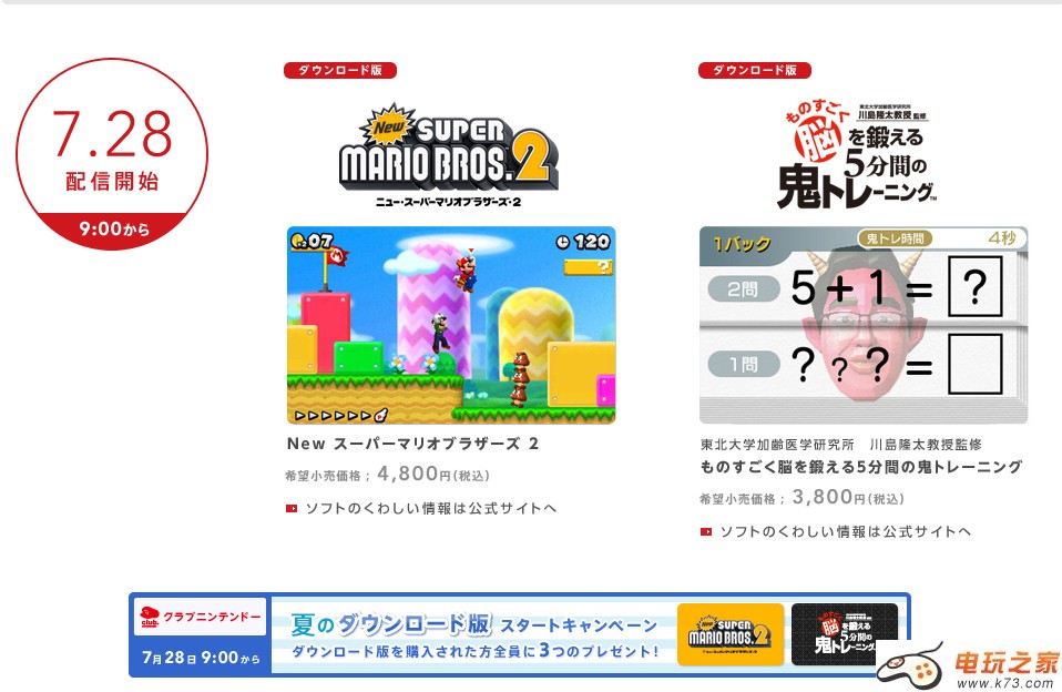 首批支持下载版游戏的两款游戏:《新超级马里奥兄弟2》和《脑锻炼5分钟魔鬼训练》