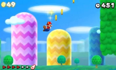 在《新超级玛丽3》首度登场的狸猫玛利欧终於回归横向卷轴的舞台,而且不像《新超级玛丽 3D乐园》只能甩尾和延缓落地时间,冲刺到最高速度後可以短暂飞行这个经典设计,也忠实呈现,又可以像以前那样飞来飞去,探索场景高处有没有藏什麽秘密。
