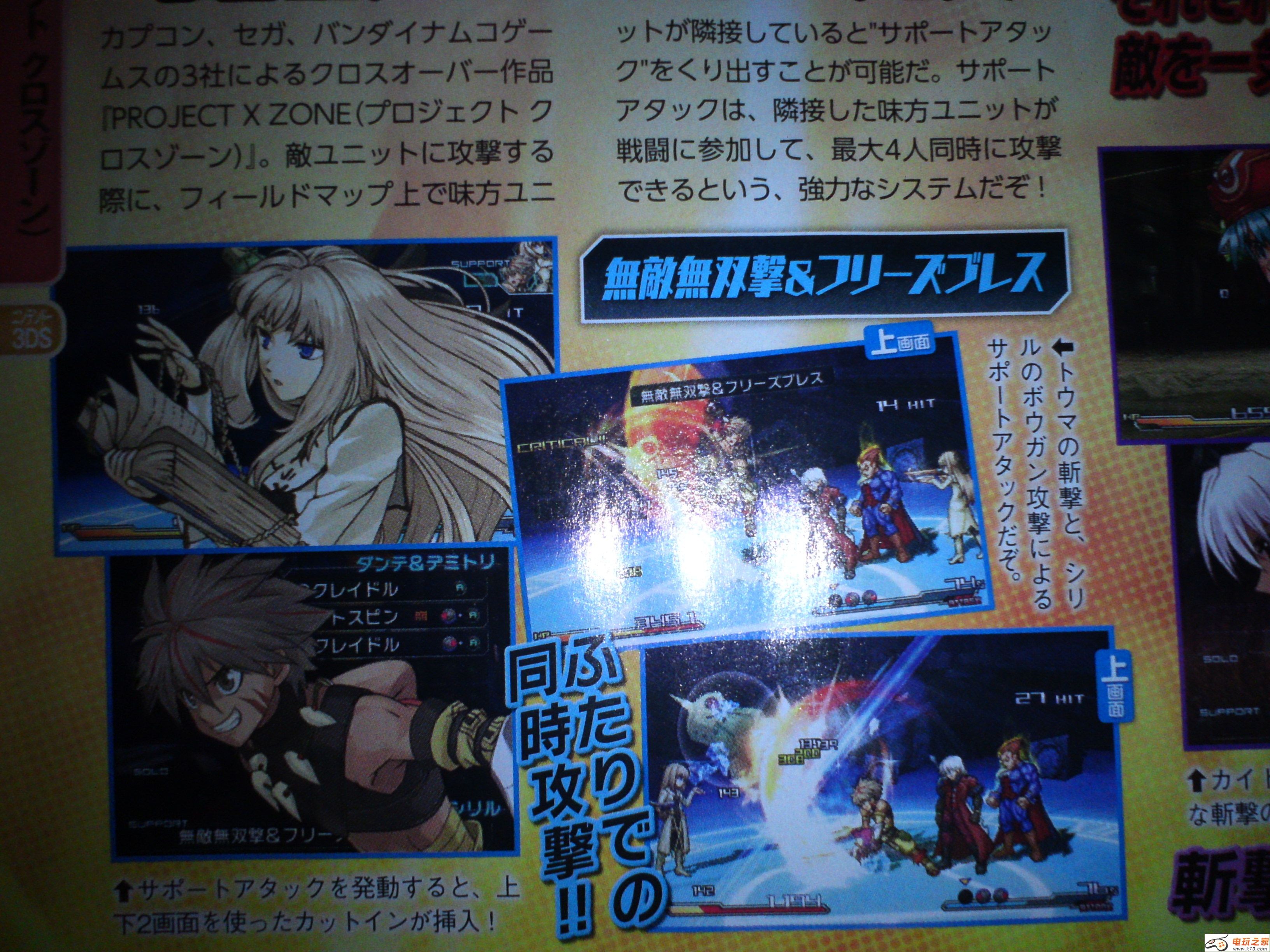 根据fami通方面的最新消息,本次登录3ds平台的《交叉领域计划》将会具有“辅助攻击”的系统,并且会利用3ds的上下屏同时发动,非常具有魄力,下面让我们来看看具体的杂志图情报吧!