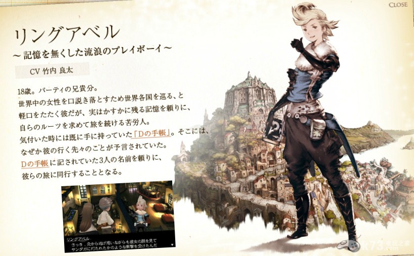 本次还公开了游戏中的第四名角色[bgcolor=rgb(255,255,255)]Ringabel.[bgcolor=rgb(255,255,255)]Ringabel是一个失去记忆的人,他旅行的目的是为了追寻他所爱少女的踪迹并向她表达爱意。他获得的“D notebook”能够预言即将发生的事情。